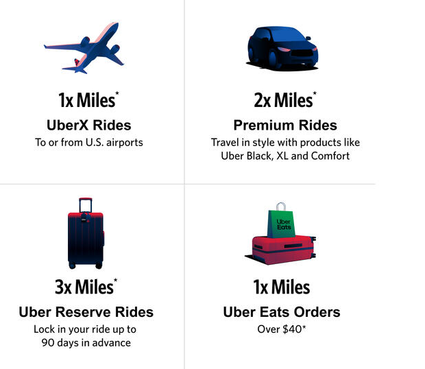 - 1 mile per eligible dollar spent on restaurant and grocery orders over $40 via Uber Eats.