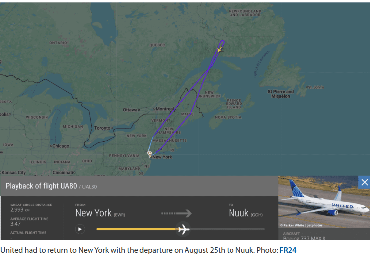 - A United Airlines Newark–Nuuk flight on August 25 had to turn back mid-route.