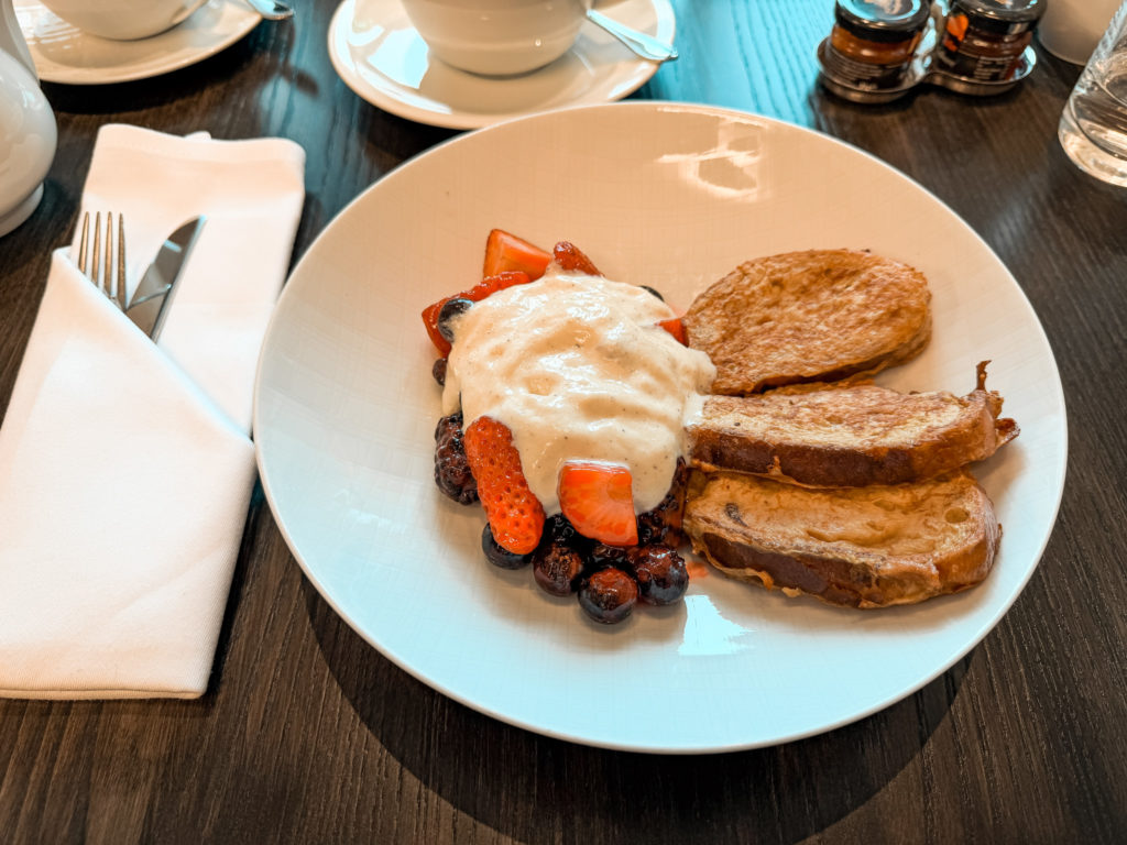 The dishes are then served by the lounge staff. During our stay, we sample several options, including the ‘Seafood & Egg’, ‘Truffle & Egg’ and French toast with berries and vanilla foam – all of which are delicious.